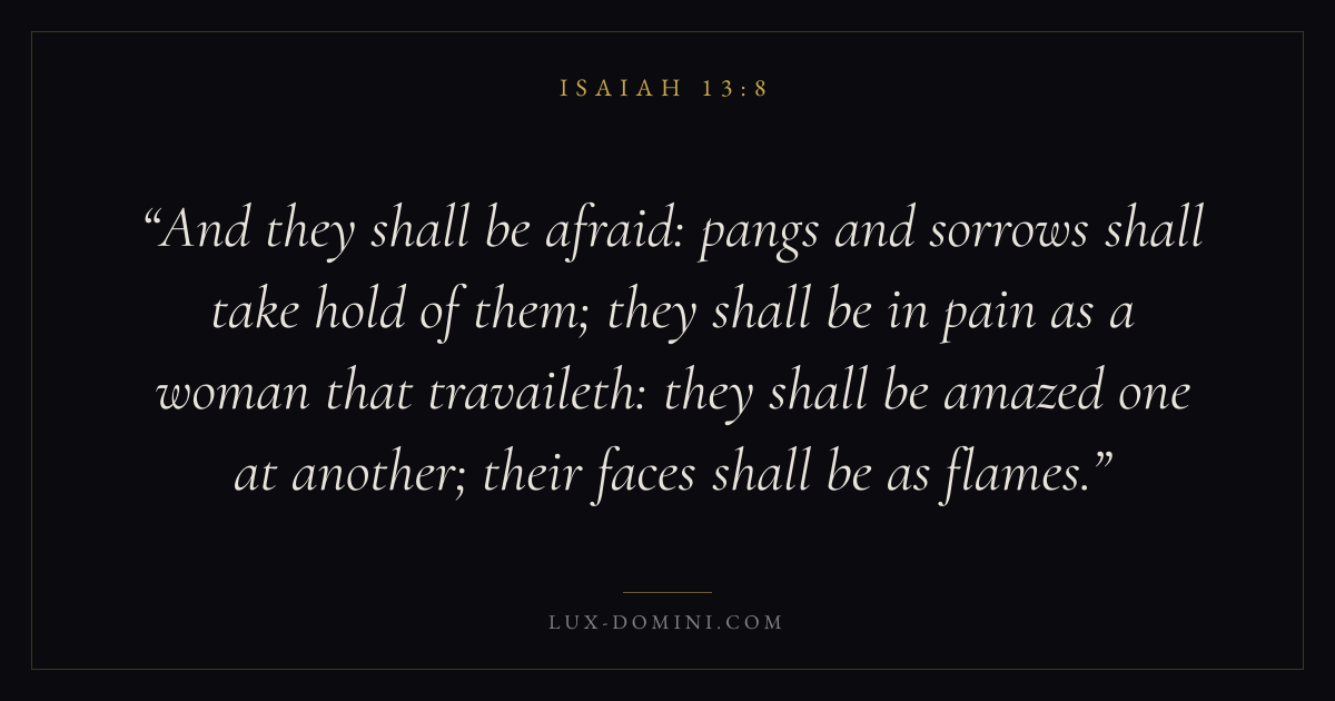 And they shall be afraid: pangs and sorrows shall take hold of them; they shall be in pain as a woman that travaileth: they shall be amazed one at another; their faces shall be as flames.