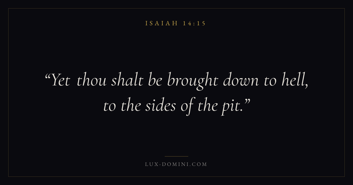 Books / Isaiah / Chapter 14 / Verse 15 ← Isaiah 14:14 Isaiah 14:15 Isaiah 14:16 → Yet thou shalt be brought down to hell, to the sides of the pit. Download verse card Share on Twitter Share on Facebook Pin it ✦ Key themes HopeJustice and mercyHolinessJudgment Read with Isaiah 14:12Isaiah 14:13Romans 8:24Revelation 21:4 Related topics Bible verses about hopeBible verses about justice and mercy ✦ Isaiah Chapter 14 verses V. 1 V. 2 V. 3 V. 4 V. 5 V. 6 V. 7 V. 8 V. 9 V. 10 V. 11 V. 12 V. 13 V. 14 V. 15 V. 16 V. 17 V. 18 V. 19 V. 20 V. 21 V. 22 V. 23 V. 24 V. 25 V. 26 V. 27 V. 28 V. 29 V. 30 V. 31 V. 32