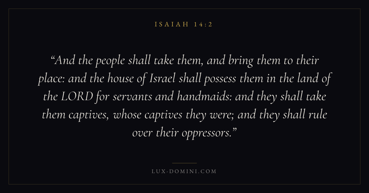 And the people shall take them, and bring them to their place: and the house of Israel shall possess them in the land of the LORD for servants and handmaids: and they shall take them captives, whose captives they were; and they shall rule over their oppressors.
