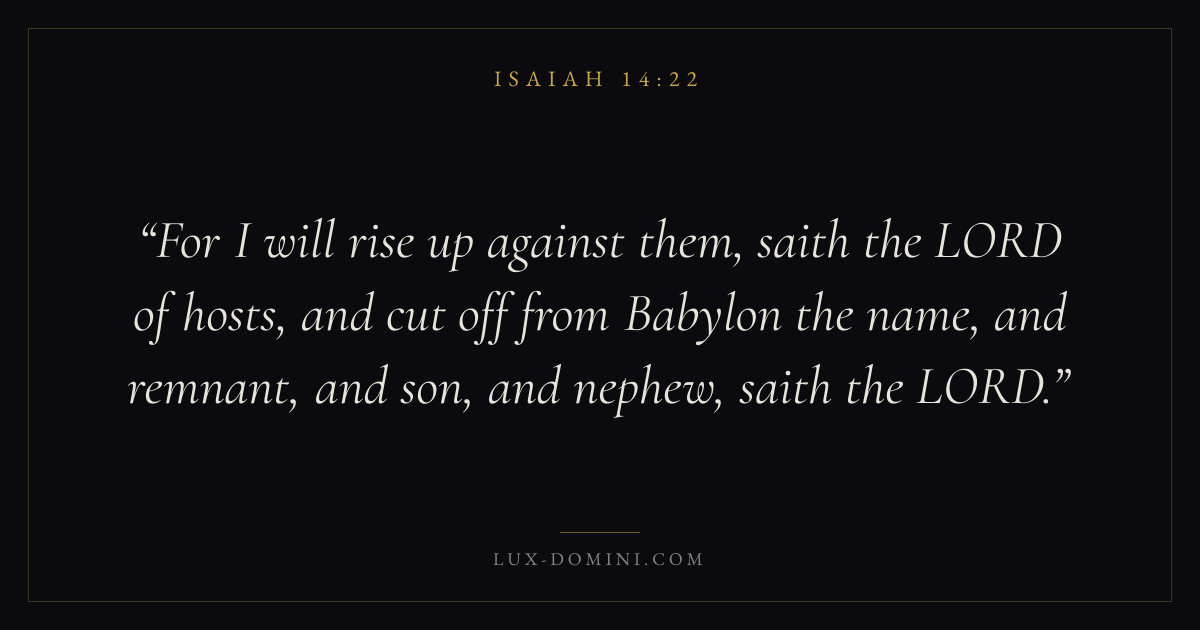 For I will rise up against them, saith the LORD of hosts, and cut off from Babylon the name, and remnant, and son, and nephew, saith the LORD.