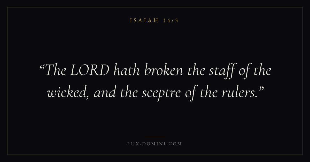 Books / Isaiah / Chapter 14 / Verse 5 ← Isaiah 14:4 Isaiah 14:5 Isaiah 14:6 → The LORD hath broken the staff of the wicked, and the sceptre of the rulers. Download verse card Share on Twitter Share on Facebook Pin it ✦ Key themes HopeJustice and mercyHolinessJudgment Read with Isaiah 14:4Romans 8:24Revelation 21:4Micah 6:8 Related topics Bible verses about hopeBible verses about justice and mercy ✦ Isaiah Chapter 14 verses V. 1 V. 2 V. 3 V. 4 V. 5 V. 6 V. 7 V. 8 V. 9 V. 10 V. 11 V. 12 V. 13 V. 14 V. 15 V. 16 V. 17 V. 18 V. 19 V. 20 V. 21 V. 22 V. 23 V. 24 V. 25 V. 26 V. 27 V. 28 V. 29 V. 30 V. 31 V. 32