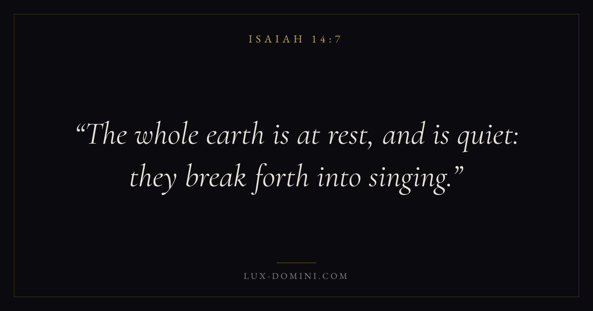 Books / Isaiah / Chapter 14 / Verse 7 ← Isaiah 14:6 Isaiah 14:7 Isaiah 14:8 → The whole earth is at rest, and is quiet: they break forth into singing. Download verse card Share on Twitter Share on Facebook Pin it ✦ Key themes HopeJustice and mercyPeaceHoliness Read with Isaiah 14:6Romans 8:24Revelation 21:4Micah 6:8 Related topics Bible verses about hopeBible verses about justice and mercyBible verses about peace ✦ Isaiah Chapter 14 verses V. 1 V. 2 V. 3 V. 4 V. 5 V. 6 V. 7 V. 8 V. 9 V. 10 V. 11 V. 12 V. 13 V. 14 V. 15 V. 16 V. 17 V. 18 V. 19 V. 20 V. 21 V. 22 V. 23 V. 24 V. 25 V. 26 V. 27 V. 28 V. 29 V. 30 V. 31 V. 32