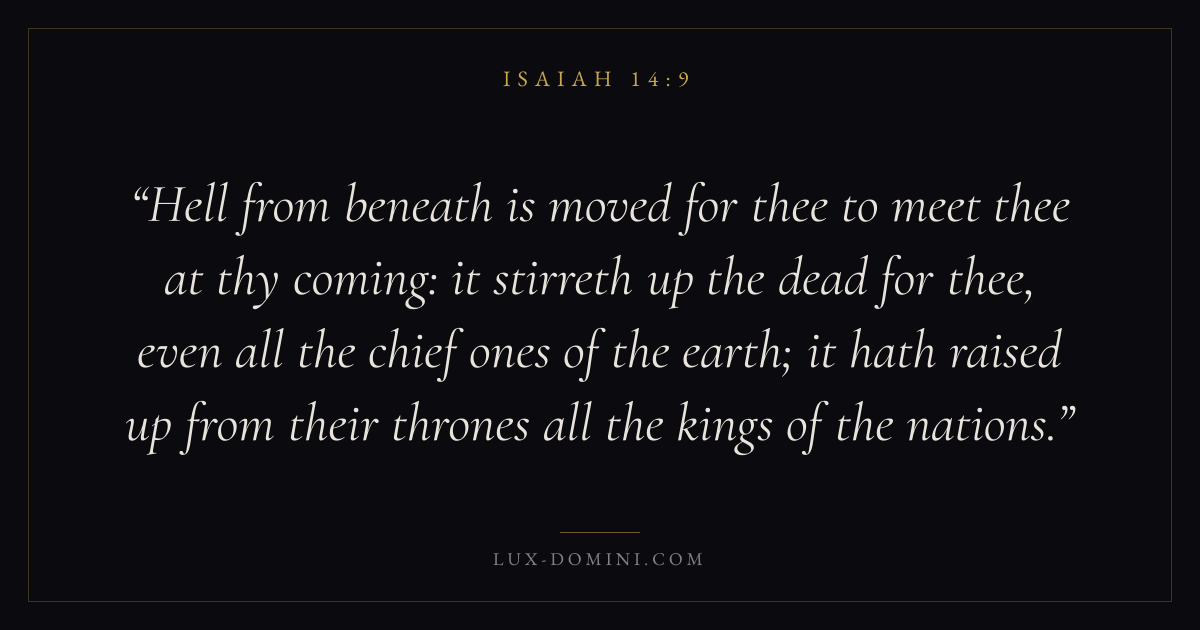 Hell from beneath is moved for thee to meet thee at thy coming: it stirreth up the dead for thee, even all the chief ones of the earth; it hath raised up from their thrones all the kings of the nations.