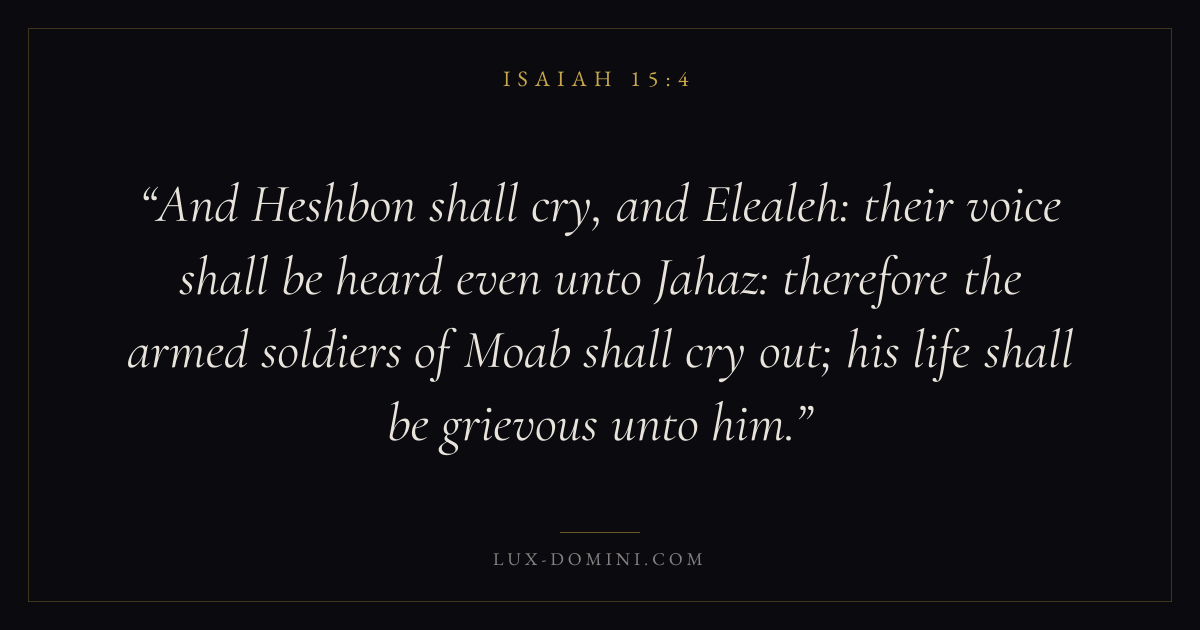 And Heshbon shall cry, and Elealeh: their voice shall be heard even unto Jahaz: therefore the armed soldiers of Moab shall cry out; his life shall be grievous unto him.