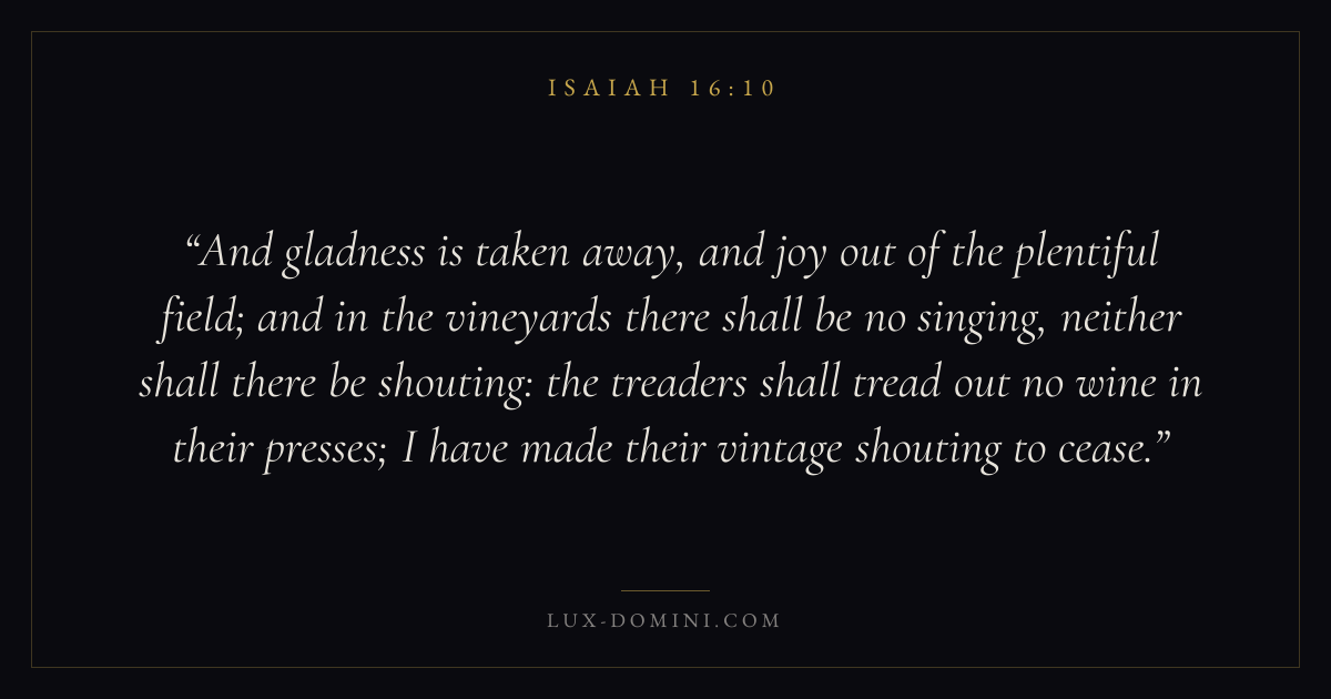 And gladness is taken away, and joy out of the plentiful field; and in the vineyards there shall be no singing, neither shall there be shouting: the treaders shall tread out no wine in their presses; I have made their vintage shouting to cease.