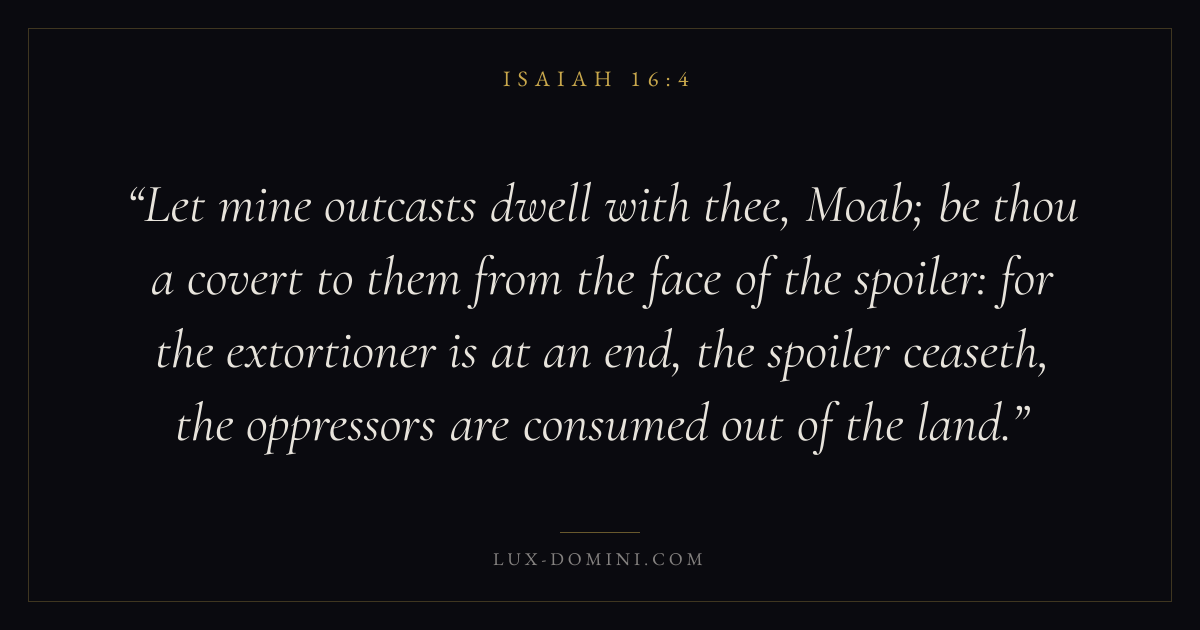 Let mine outcasts dwell with thee, Moab; be thou a covert to them from the face of the spoiler: for the extortioner is at an end, the spoiler ceaseth, the oppressors are consumed out of the land.