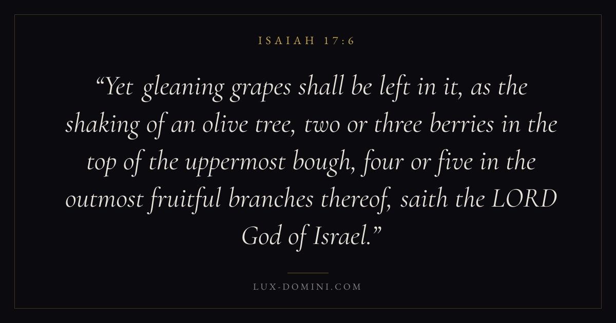 Yet gleaning grapes shall be left in it, as the shaking of an olive tree, two or three berries in the top of the uppermost bough, four or five in the outmost fruitful branches thereof, saith the LORD God of Israel.