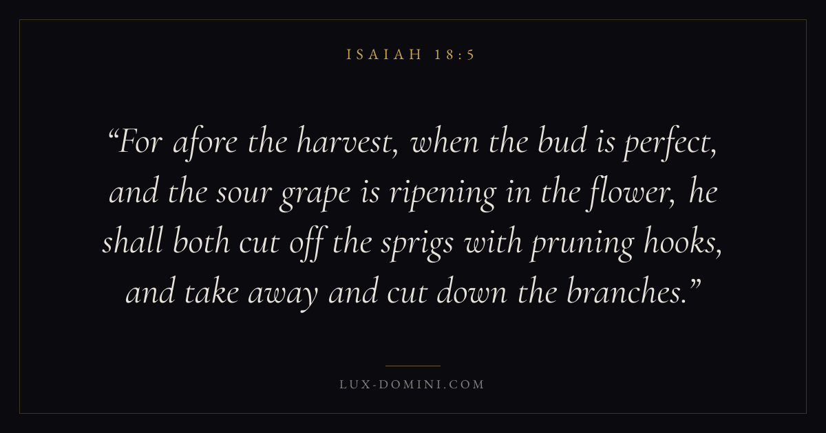 For afore the harvest, when the bud is perfect, and the sour grape is ripening in the flower, he shall both cut off the sprigs with pruning hooks, and take away and cut down the branches.