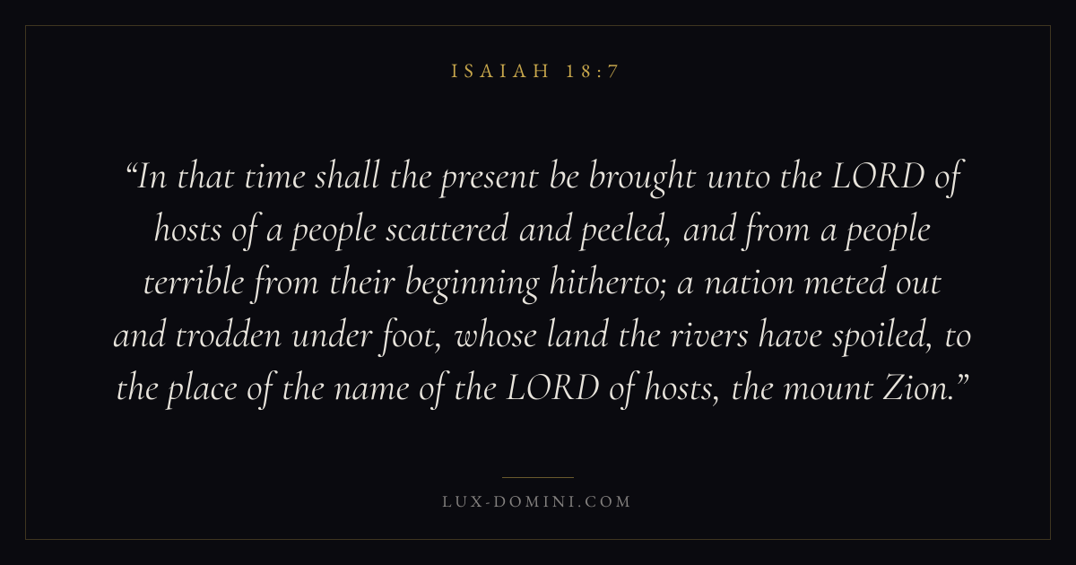In that time shall the present be brought unto the LORD of hosts of a people scattered and peeled, and from a people terrible from their beginning hitherto; a nation meted out and trodden under foot, whose land the rivers have spoiled, to the place of the name of the LORD of hosts, the mount Zion.
