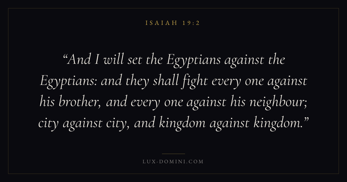 And I will set the Egyptians against the Egyptians: and they shall fight every one against his brother, and every one against his neighbour; city against city, and kingdom against kingdom.