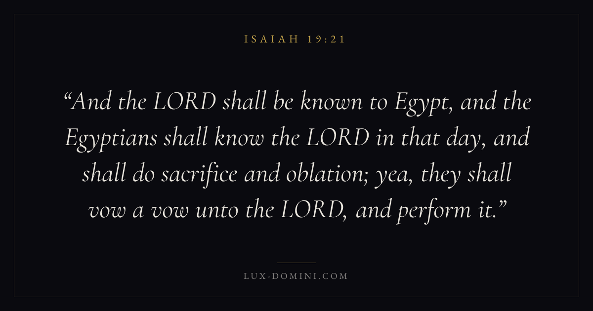 And the LORD shall be known to Egypt, and the Egyptians shall know the LORD in that day, and shall do sacrifice and oblation; yea, they shall vow a vow unto the LORD, and perform it.
