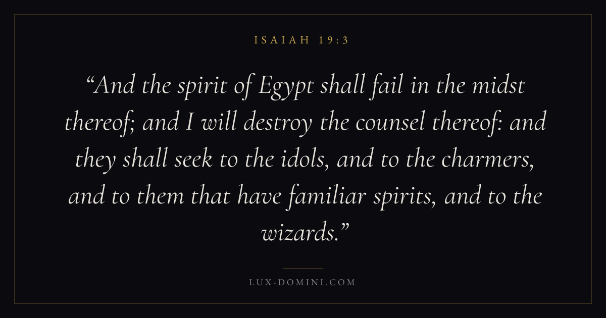 And the spirit of Egypt shall fail in the midst thereof; and I will destroy the counsel thereof: and they shall seek to the idols, and to the charmers, and to them that have familiar spirits, and to the wizards.
