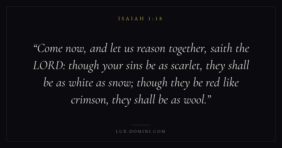 Come now, and let us reason together, saith the LORD: though your sins be as scarlet, they shall be as white as snow; though they be red like crimson, they shall be as wool.