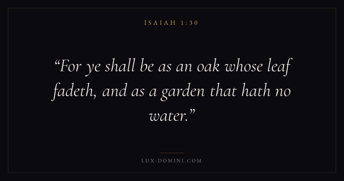 Books / Isaiah / Chapter 1 / Verse 30 ← Isaiah 1:29 Isaiah 1:30 Isaiah 1:31 → For ye shall be as an oak whose leaf fadeth, and as a garden that hath no water. Download verse card Share on Twitter Share on Facebook Pin it ✦ Key themes FaithJustice and mercyPeaceHoliness Read with Isaiah 1:28Isaiah 1:29Hebrews 11:1Romans 10:17 Related topics Bible verses about faithBible verses about justice and mercyBible verses about peace ✦ Isaiah Chapter 1 verses V. 1 V. 2 V. 3 V. 4 V. 5 V. 6 V. 7 V. 8 V. 9 V. 10 V. 11 V. 12 V. 13 V. 14 V. 15 V. 16 V. 17 V. 18 V. 19 V. 20 V. 21 V. 22 V. 23 V. 24 V. 25 V. 26 V. 27 V. 28 V. 29 V. 30 V. 31