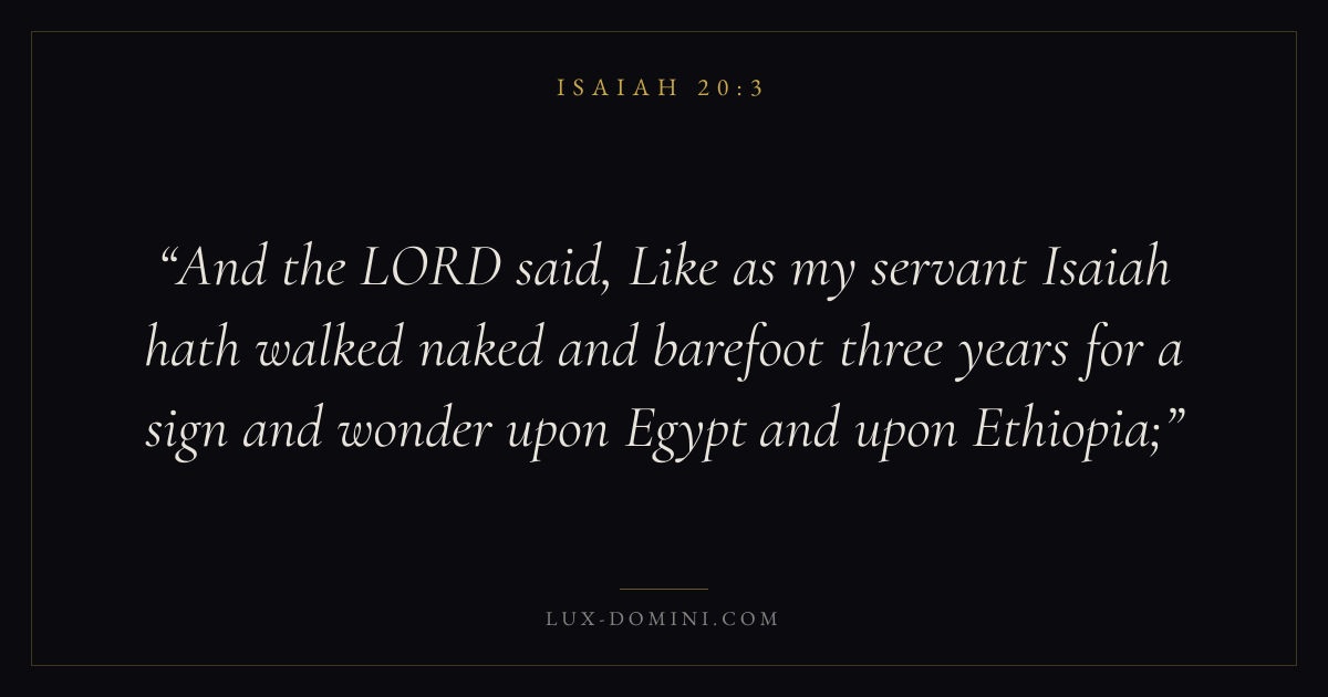 And the LORD said, Like as my servant Isaiah hath walked naked and barefoot three years for a sign and wonder upon Egypt and upon Ethiopia;