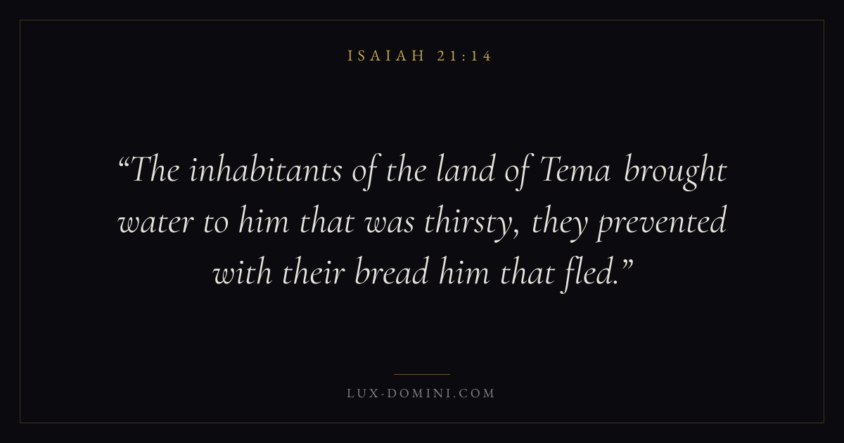 The inhabitants of the land of Tema brought water to him that was thirsty, they prevented with their bread him that fled.
