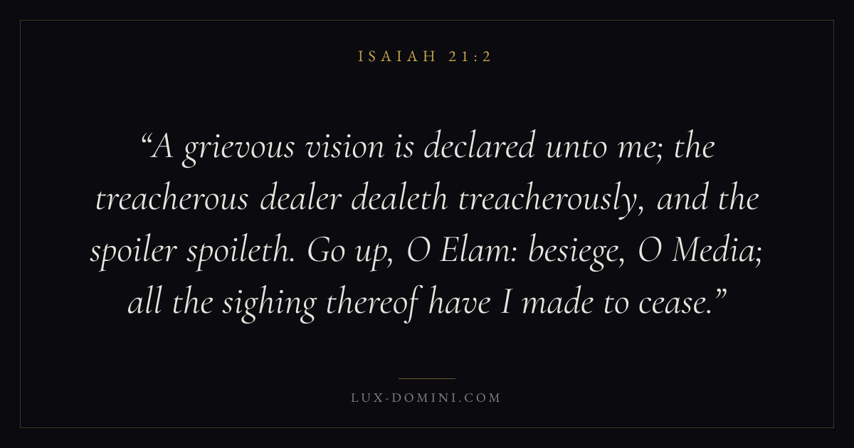 A grievous vision is declared unto me; the treacherous dealer dealeth treacherously, and the spoiler spoileth. Go up, O Elam: besiege, O Media; all the sighing thereof have I made to cease.