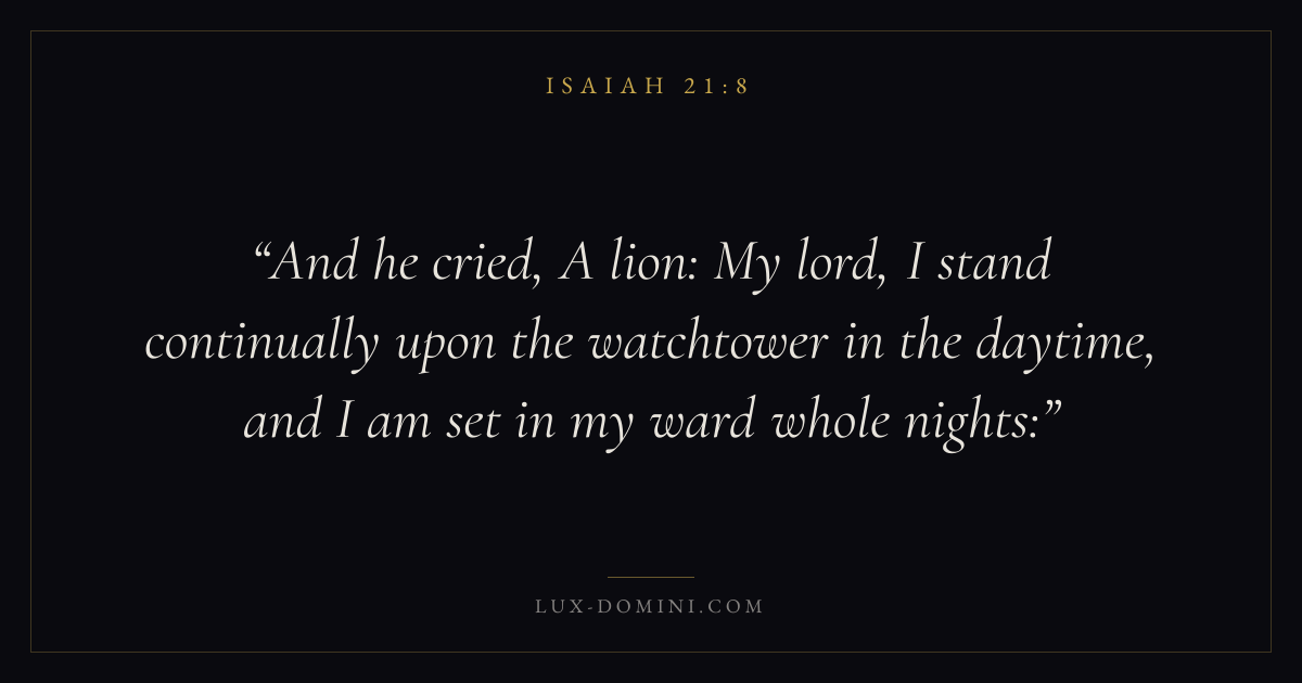 And he cried, A lion: My lord, I stand continually upon the watchtower in the daytime, and I am set in my ward whole nights: