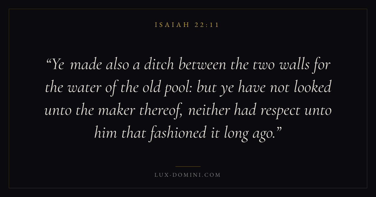 Ye made also a ditch between the two walls for the water of the old pool: but ye have not looked unto the maker thereof, neither had respect unto him that fashioned it long ago.