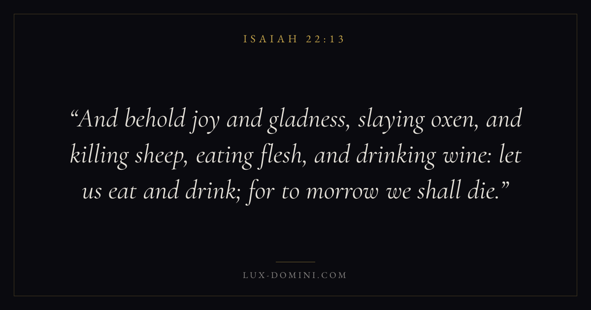 And behold joy and gladness, slaying oxen, and killing sheep, eating flesh, and drinking wine: let us eat and drink; for to morrow we shall die.