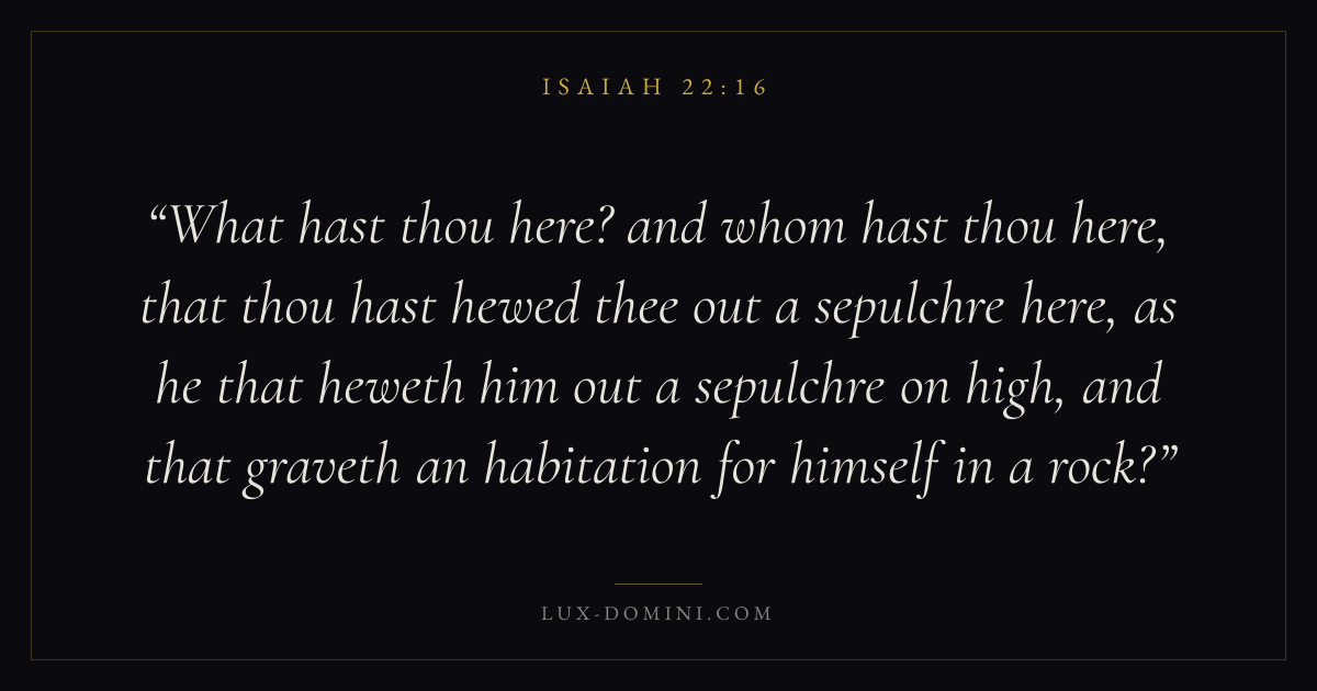 What hast thou here? and whom hast thou here, that thou hast hewed thee out a sepulchre here, as he that heweth him out a sepulchre on high, and that graveth an habitation for himself in a rock?