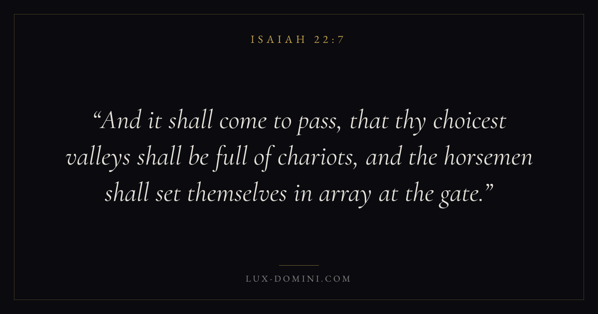 And it shall come to pass, that thy choicest valleys shall be full of chariots, and the horsemen shall set themselves in array at the gate.