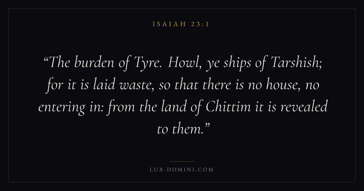 The burden of Tyre. Howl, ye ships of Tarshish; for it is laid waste, so that there is no house, no entering in: from the land of Chittim it is revealed to them.