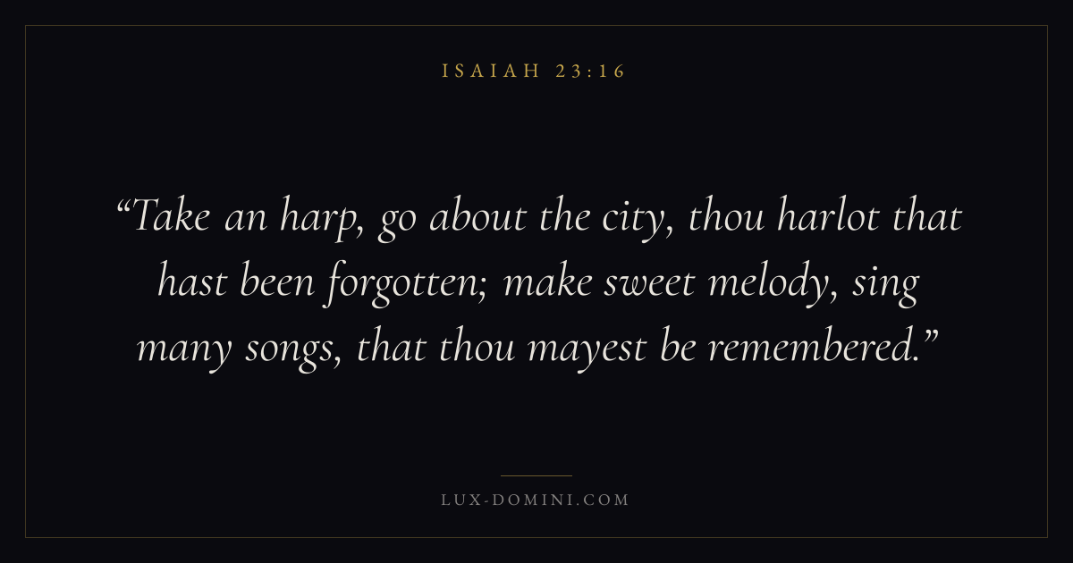 Take an harp, go about the city, thou harlot that hast been forgotten; make sweet melody, sing many songs, that thou mayest be remembered.