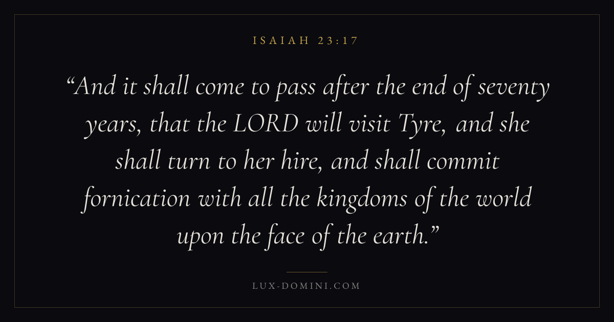 And it shall come to pass after the end of seventy years, that the LORD will visit Tyre, and she shall turn to her hire, and shall commit fornication with all the kingdoms of the world upon the face of the earth.