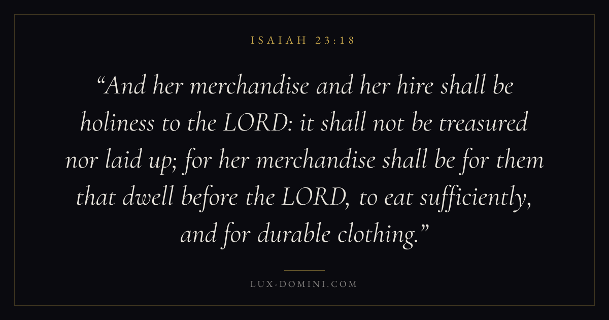 And her merchandise and her hire shall be holiness to the LORD: it shall not be treasured nor laid up; for her merchandise shall be for them that dwell before the LORD, to eat sufficiently, and for durable clothing.