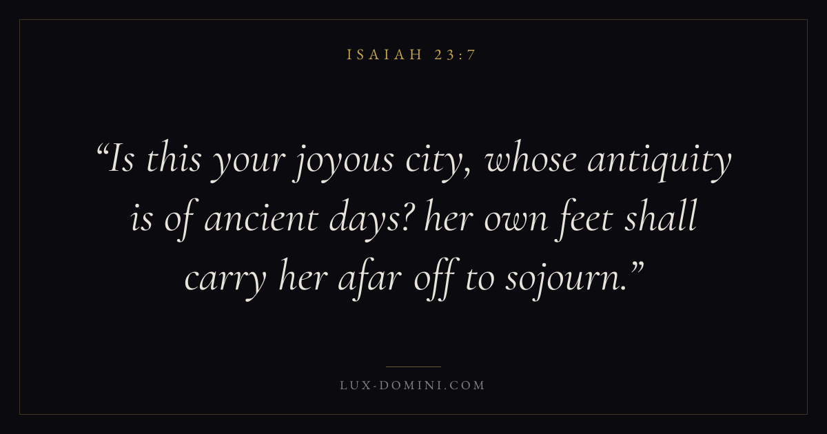 Is this your joyous city, whose antiquity is of ancient days? her own feet shall carry her afar off to sojourn.