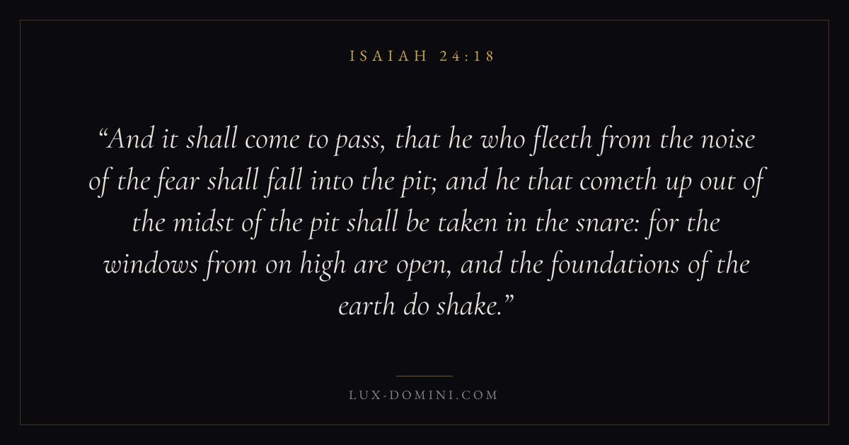 And it shall come to pass, that he who fleeth from the noise of the fear shall fall into the pit; and he that cometh up out of the midst of the pit shall be taken in the snare: for the windows from on high are open, and the foundations of the earth do shake.