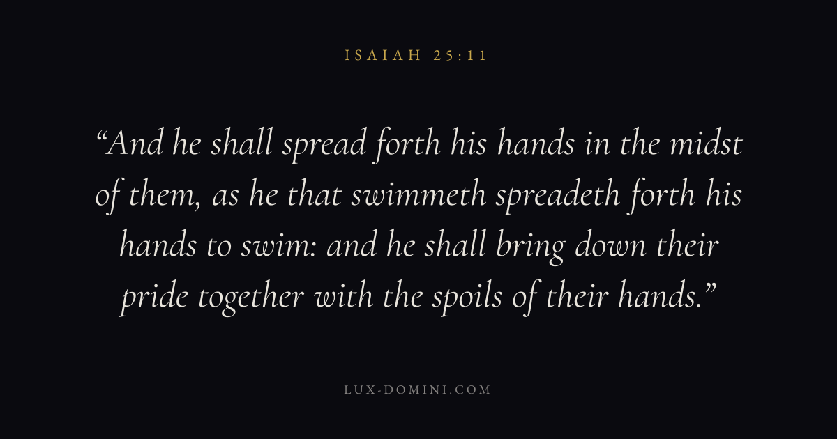 And he shall spread forth his hands in the midst of them, as he that swimmeth spreadeth forth his hands to swim: and he shall bring down their pride together with the spoils of their hands.