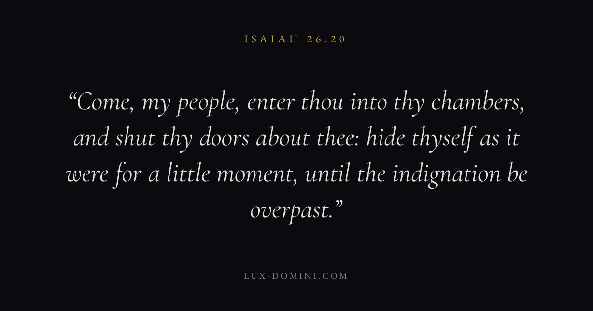 Come, my people, enter thou into thy chambers, and shut thy doors about thee: hide thyself as it were for a little moment, until the indignation be overpast.