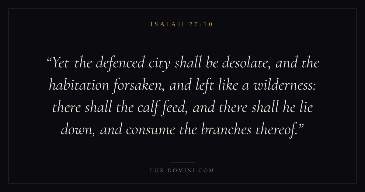 Yet the defenced city shall be desolate, and the habitation forsaken, and left like a wilderness: there shall the calf feed, and there shall he lie down, and consume the branches thereof.