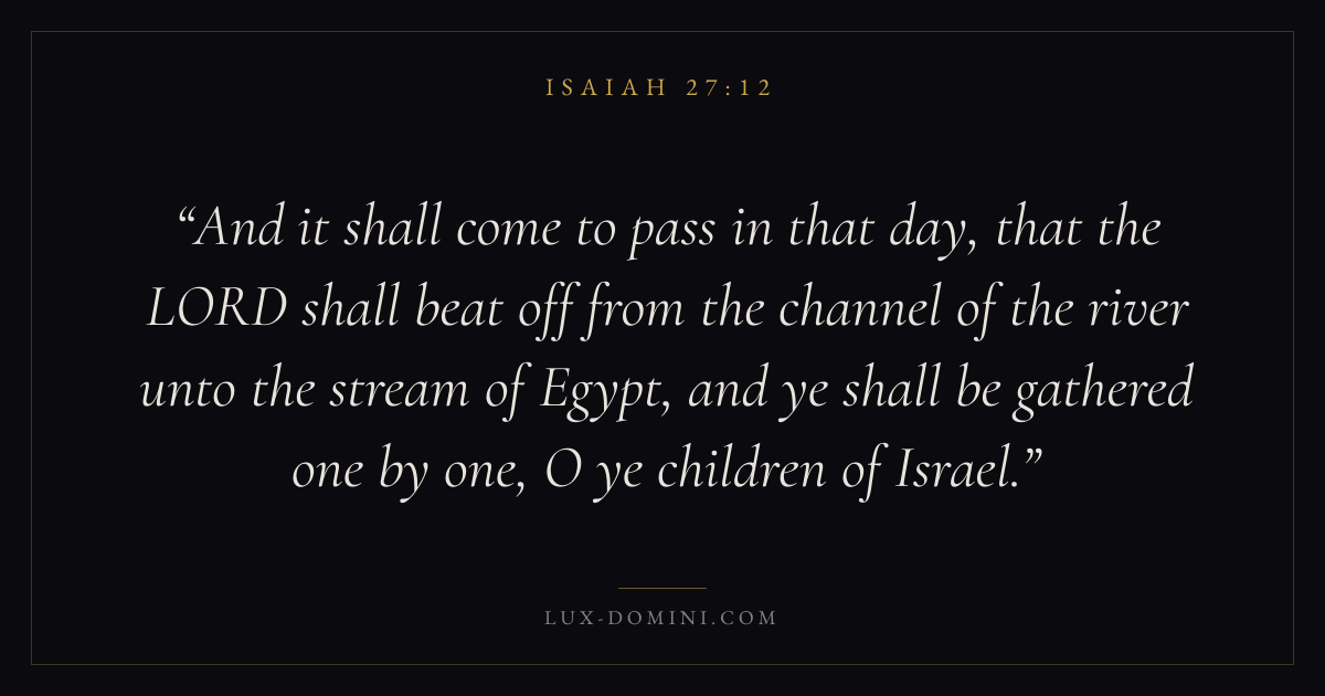 And it shall come to pass in that day, that the LORD shall beat off from the channel of the river unto the stream of Egypt, and ye shall be gathered one by one, O ye children of Israel.