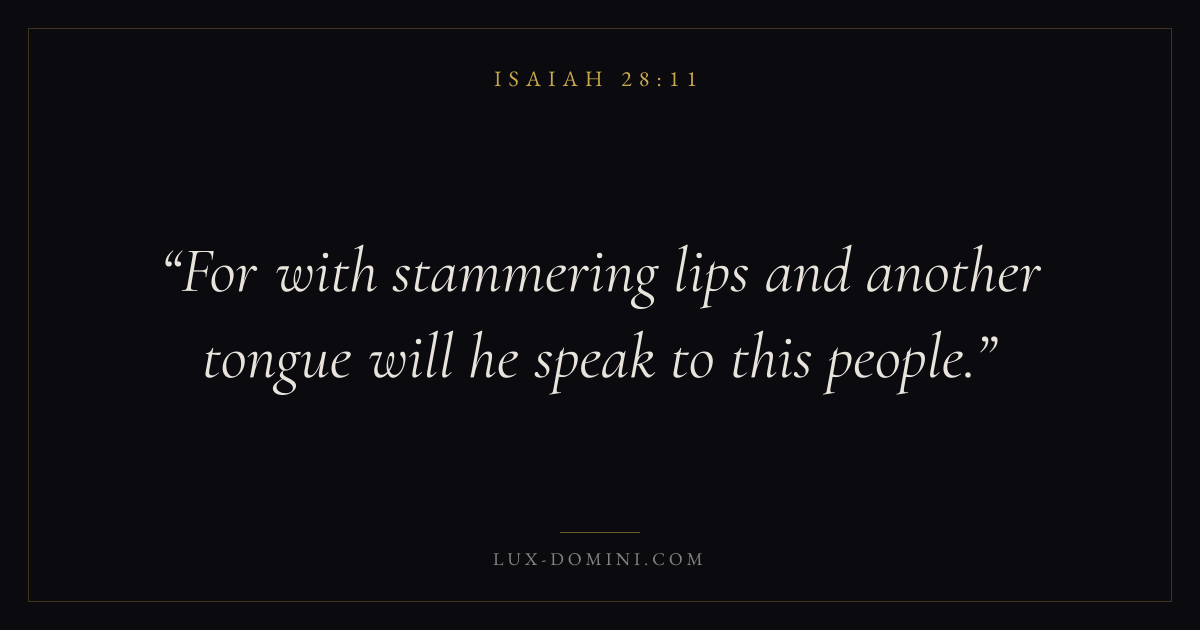 Books / Isaiah / Chapter 28 / Verse 11 ← Isaiah 28:10 Isaiah 28:11 Isaiah 28:12 → For with stammering lips and another tongue will he speak to this people. Download verse card Share on Twitter Share on Facebook Pin it ✦ Key themes Justice and mercyHolinessJudgmentRemnant Read with Isaiah 28:9Isaiah 28:10Micah 6:8Amos 5:24 Related topics Bible verses about justice and mercy ✦ Isaiah Chapter 28 verses V. 1 V. 2 V. 3 V. 4 V. 5 V. 6 V. 7 V. 8 V. 9 V. 10 V. 11 V. 12 V. 13 V. 14 V. 15 V. 16 V. 17 V. 18 V. 19 V. 20 V. 21 V. 22 V. 23 V. 24 V. 25 V. 26 V. 27 V. 28 V. 29