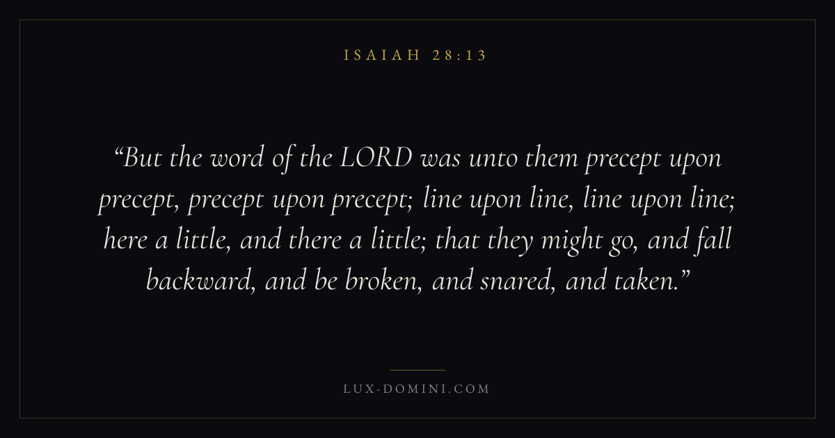 But the word of the LORD was unto them precept upon precept, precept upon precept; line upon line, line upon line; here a little, and there a little; that they might go, and fall backward, and be broken, and snared, and taken.