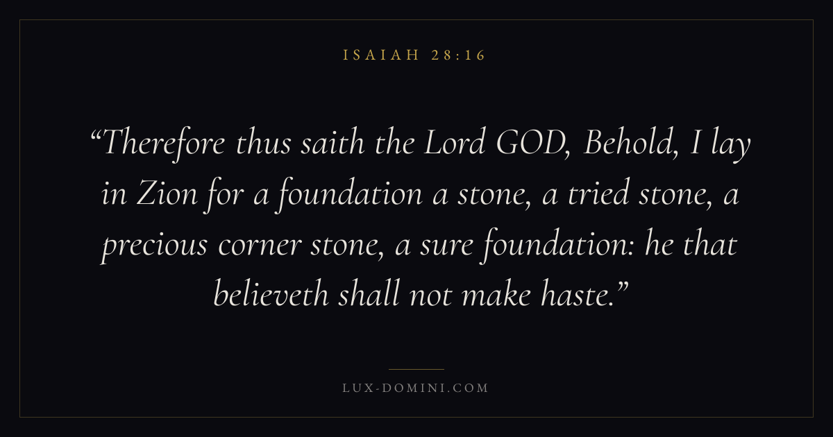 Therefore thus saith the Lord GOD, Behold, I lay in Zion for a foundation a stone, a tried stone, a precious corner stone, a sure foundation: he that believeth shall not make haste.