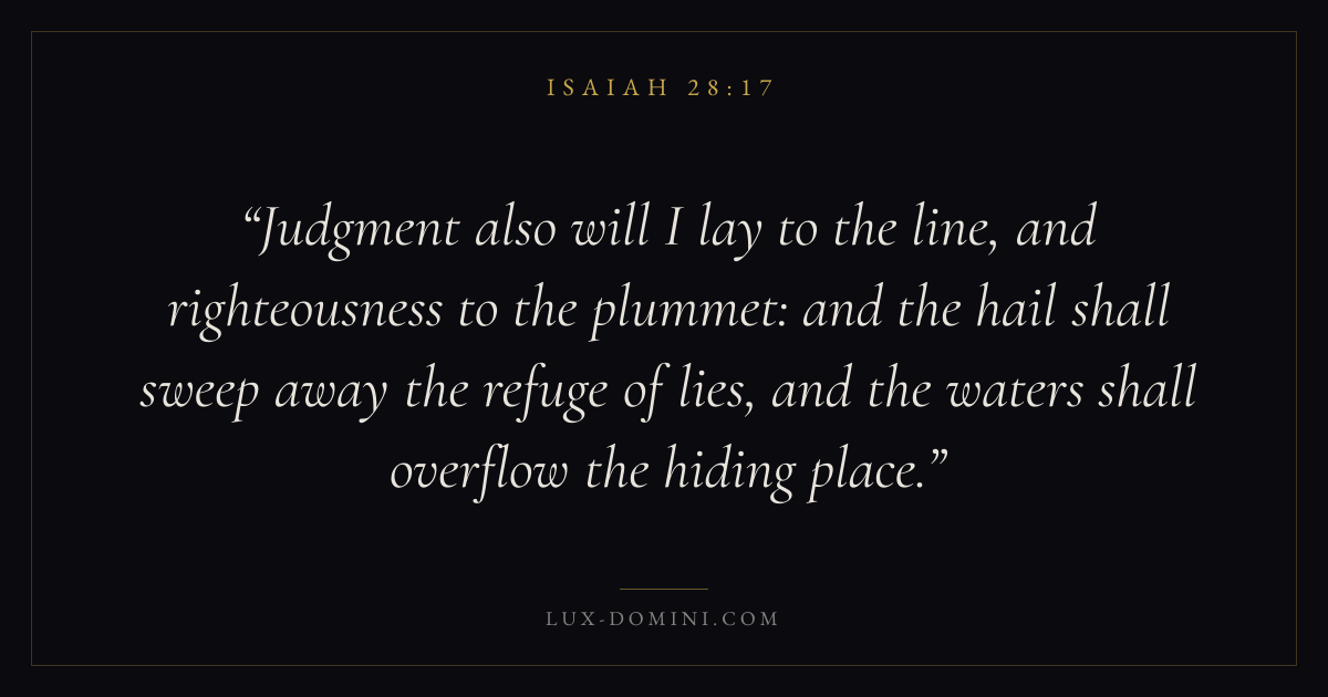 Judgment also will I lay to the line, and righteousness to the plummet: and the hail shall sweep away the refuge of lies, and the waters shall overflow the hiding place.