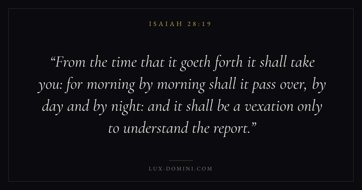 From the time that it goeth forth it shall take you: for morning by morning shall it pass over, by day and by night: and it shall be a vexation only to understand the report.