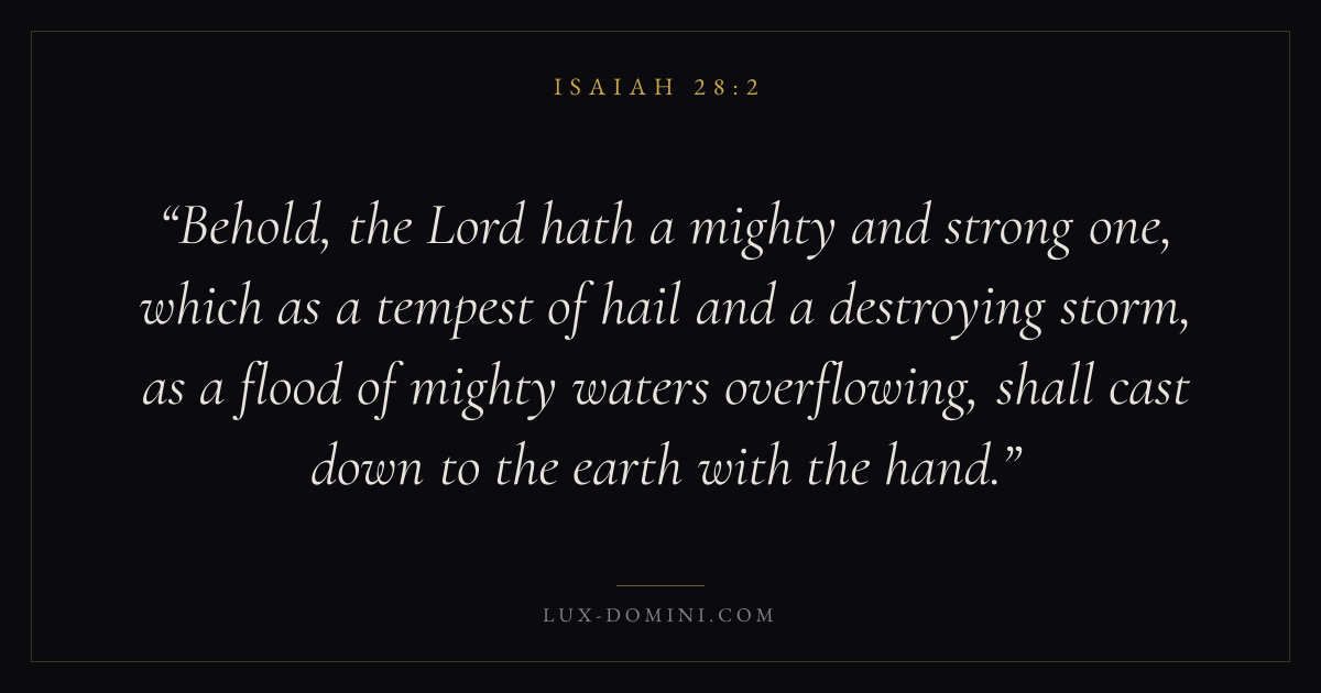 Behold, the Lord hath a mighty and strong one, which as a tempest of hail and a destroying storm, as a flood of mighty waters overflowing, shall cast down to the earth with the hand.