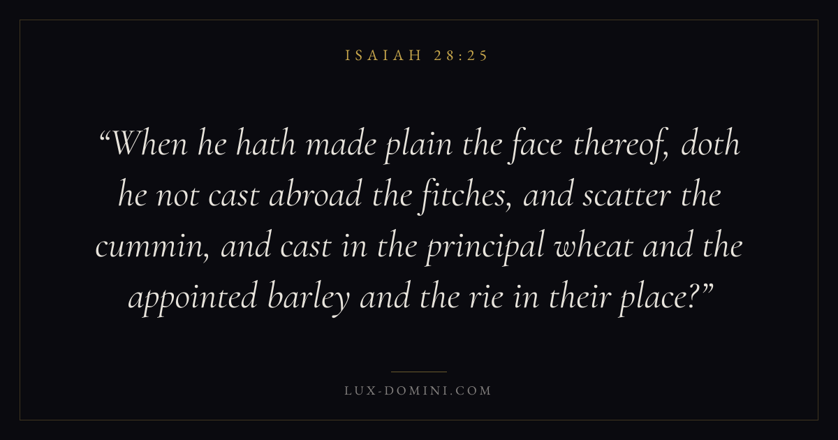 When he hath made plain the face thereof, doth he not cast abroad the fitches, and scatter the cummin, and cast in the principal wheat and the appointed barley and the rie in their place?