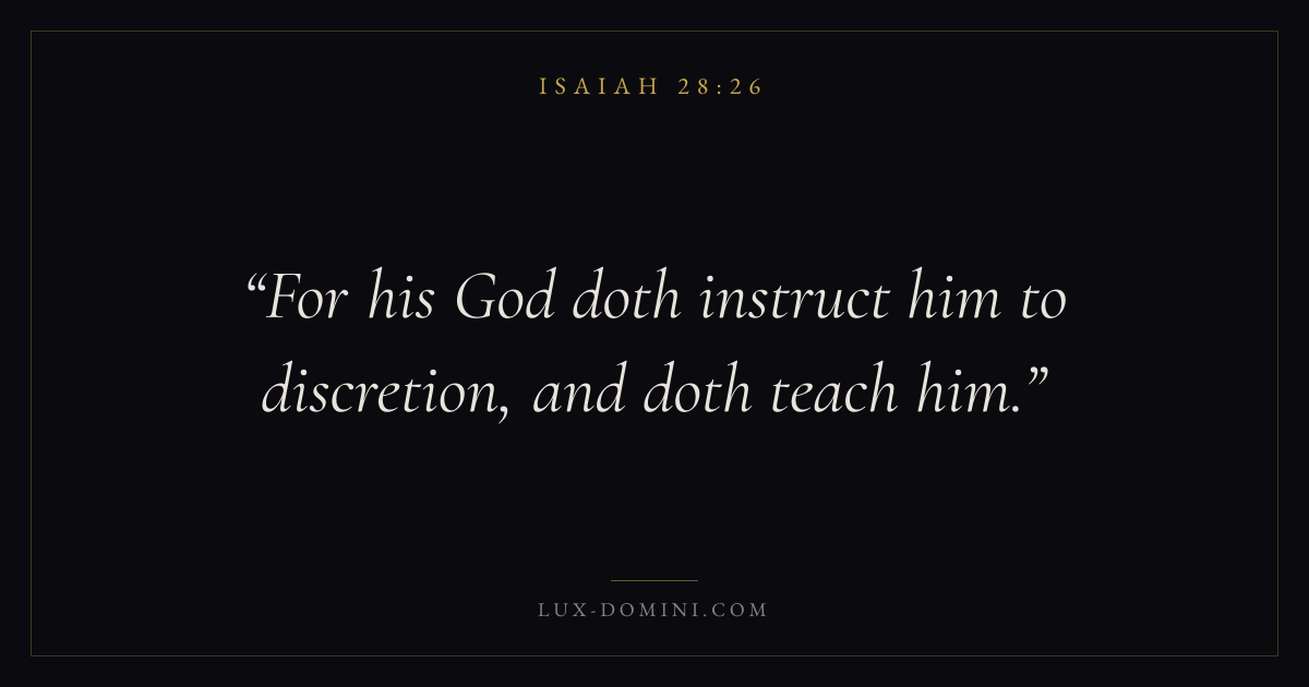 Books / Isaiah / Chapter 28 / Verse 26 ← Isaiah 28:25 Isaiah 28:26 Isaiah 28:27 → For his God doth instruct him to discretion, and doth teach him. Download verse card Share on Twitter Share on Facebook Pin it ✦ Key themes WisdomJustice and mercyHolinessJudgment Read with Isaiah 28:25Isaiah 28:27Proverbs 1:7James 1:5 Related topics Bible verses about wisdomBible verses about justice and mercy ✦ Isaiah Chapter 28 verses V. 1 V. 2 V. 3 V. 4 V. 5 V. 6 V. 7 V. 8 V. 9 V. 10 V. 11 V. 12 V. 13 V. 14 V. 15 V. 16 V. 17 V. 18 V. 19 V. 20 V. 21 V. 22 V. 23 V. 24 V. 25 V. 26 V. 27 V. 28 V. 29