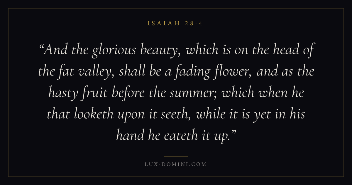 And the glorious beauty, which is on the head of the fat valley, shall be a fading flower, and as the hasty fruit before the summer; which when he that looketh upon it seeth, while it is yet in his hand he eateth it up.