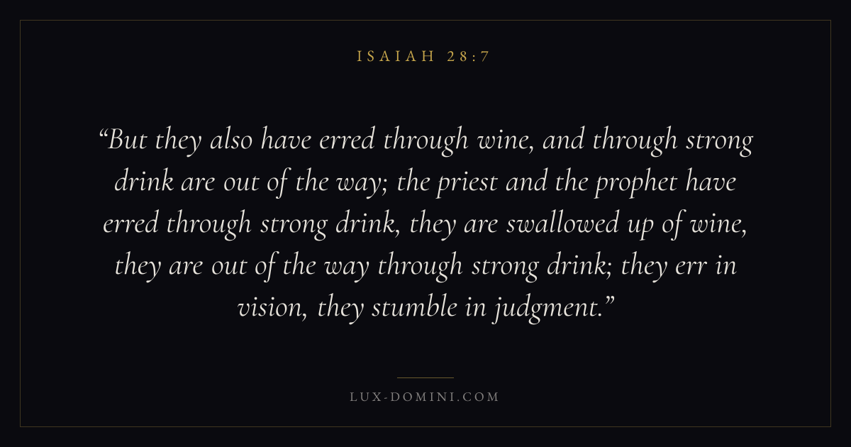 But they also have erred through wine, and through strong drink are out of the way; the priest and the prophet have erred through strong drink, they are swallowed up of wine, they are out of the way through strong drink; they err in vision, they stumble in judgment.