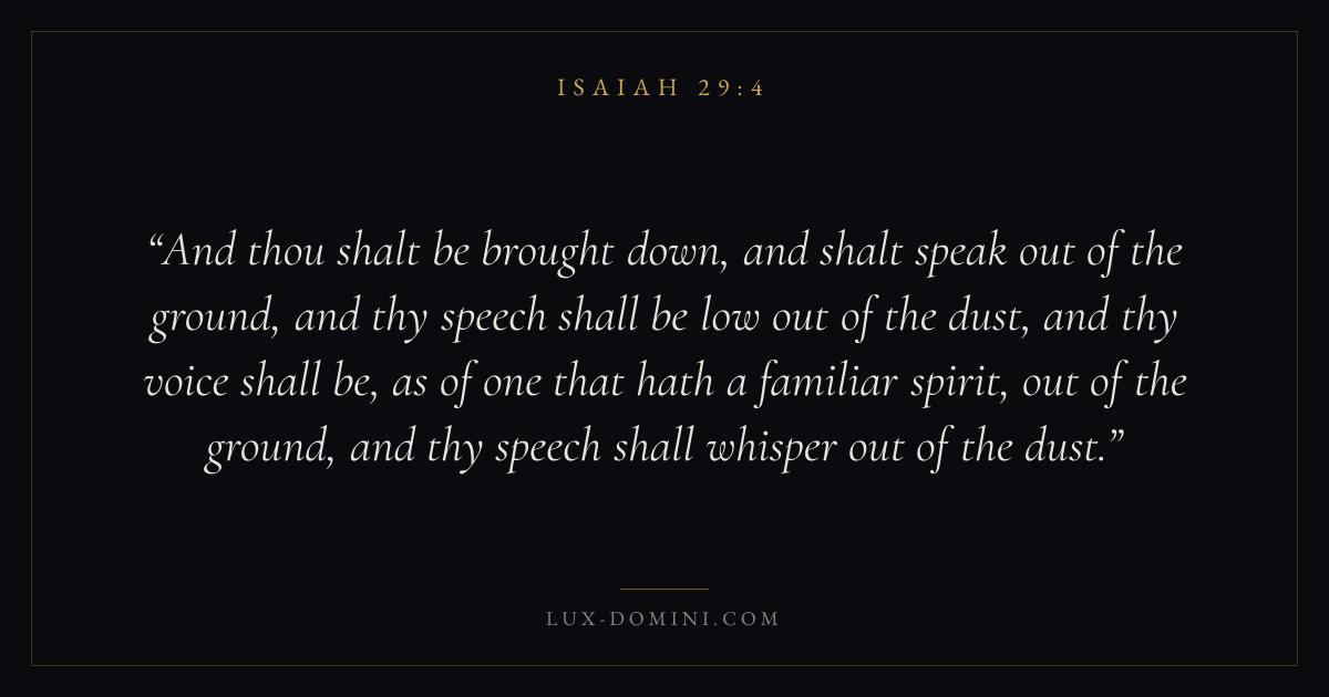 And thou shalt be brought down, and shalt speak out of the ground, and thy speech shall be low out of the dust, and thy voice shall be, as of one that hath a familiar spirit, out of the ground, and thy speech shall whisper out of the dust.