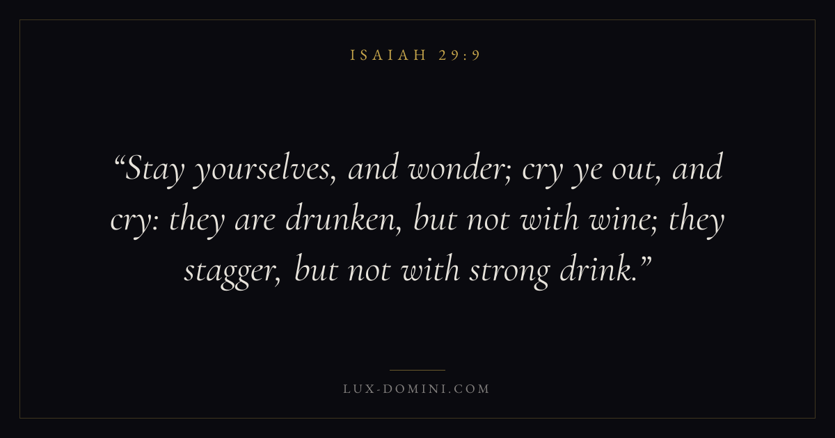 Stay yourselves, and wonder; cry ye out, and cry: they are drunken, but not with wine; they stagger, but not with strong drink.