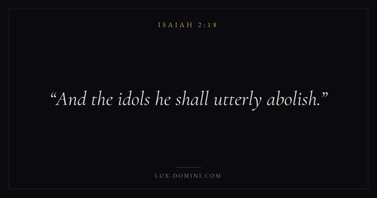 Books / Isaiah / Chapter 2 / Verse 18 ← Isaiah 2:17 Isaiah 2:18 Isaiah 2:19 → And the idols he shall utterly abolish. Download verse card Share on Twitter Share on Facebook Pin it ✦ Key themes Justice and mercyHolinessJudgmentRemnant Read with Isaiah 2:16Isaiah 2:17Micah 6:8Amos 5:24 Related topics Bible verses about justice and mercy ✦ Isaiah Chapter 2 verses V. 1 V. 2 V. 3 V. 4 V. 5 V. 6 V. 7 V. 8 V. 9 V. 10 V. 11 V. 12 V. 13 V. 14 V. 15 V. 16 V. 17 V. 18 V. 19 V. 20 V. 21 V. 22