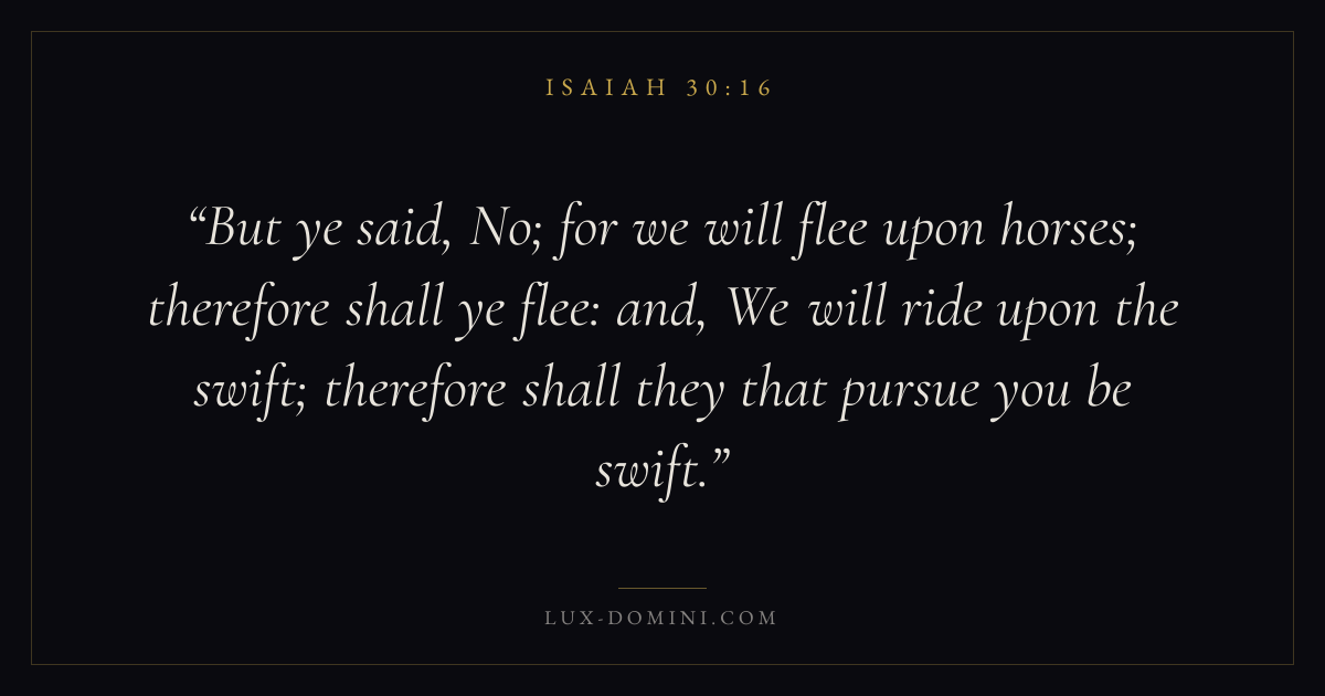 But ye said, No; for we will flee upon horses; therefore shall ye flee: and, We will ride upon the swift; therefore shall they that pursue you be swift.